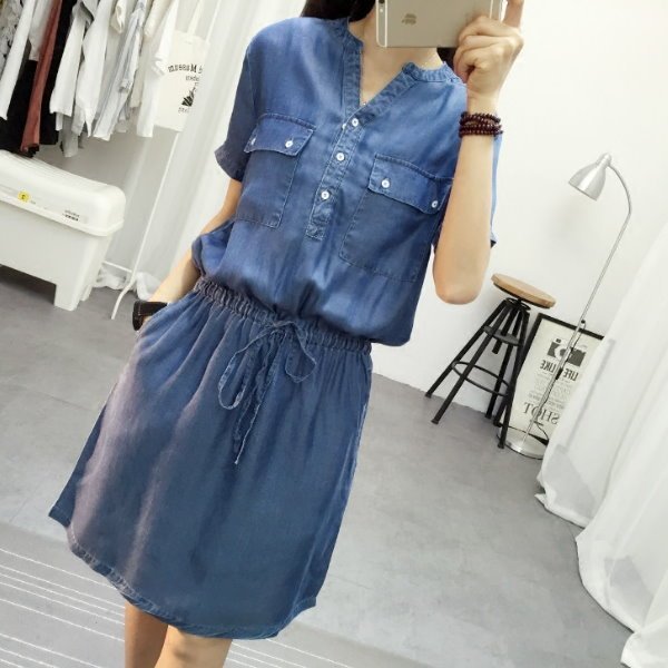 優寶購物《ubao.Tw》特貨品商城,黑貓宅配,取貨付款,牛仔洋裝 #G-085 圓領小V排釦鬆緊腰連身裙款 | Yahoo拍賣