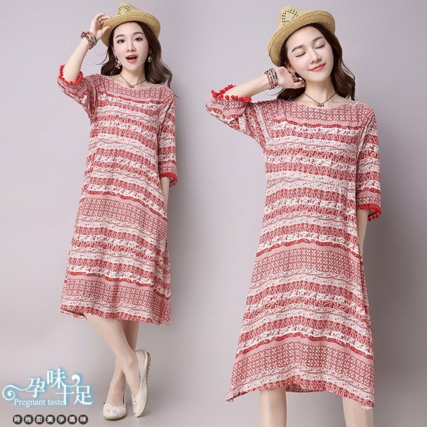 優寶購物《ubao.Tw》特貨品商城,黑貓宅配,取貨付款,復古印花流蘇袖口孕婦洋裝 紅【CQH81620】孕味十足 孕婦裝 | Yahoo拍賣