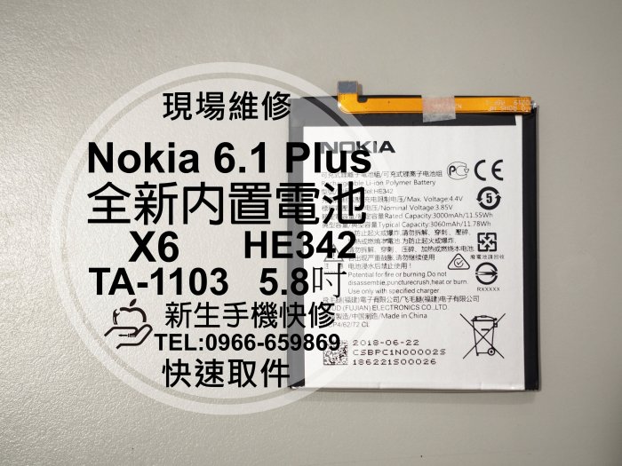 優寶購物《ubao.Tw》特貨品商城,黑貓宅配,取貨付款,免運【新生手機快修】諾基亞 Nokia 6.1+ 內置電池 衰退膨脹 自動斷電 TA-1103 HE342 現場維修更換 | Yahoo拍賣