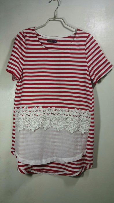 優寶購物《ubao.Tw》特貨品商城,黑貓宅配,取貨付款,※蜜彩BABY熊※專櫃J&L紅色白橫條蕾絲短袖長版上衣 | Yahoo拍賣