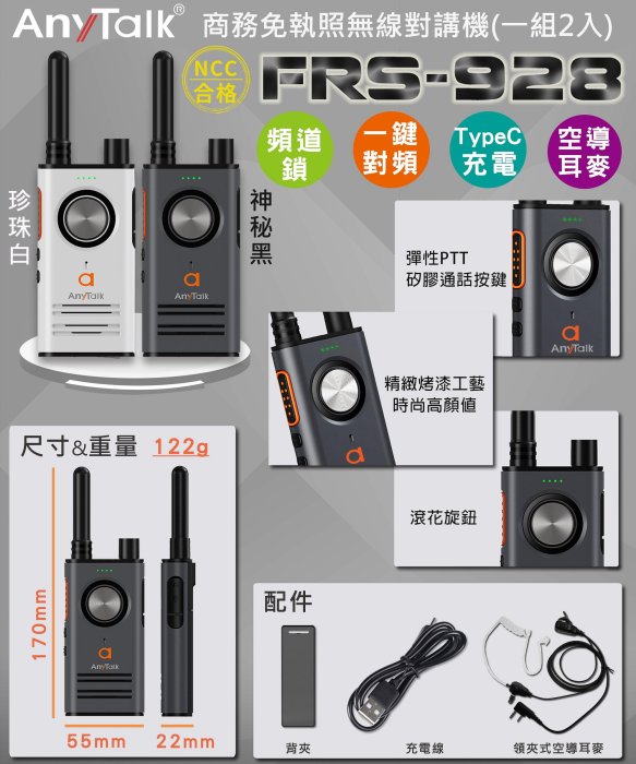 優寶購物《ubao.Tw》特貨品商城,黑貓宅配,取貨付款,AnyTalk FRS-928 免執照無線對講機 (一組2入) TYPE-C充電 贈 領夾式空導耳麥 | Yahoo拍賣