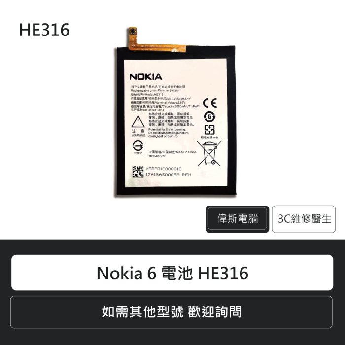 優寶購物《ubao.Tw》特貨品商城,黑貓宅配,取貨付款,☆偉斯科技☆諾基亞 Nokia 6 電池 HE316 手機電池 鋰電池 電池更換 | Yahoo拍賣