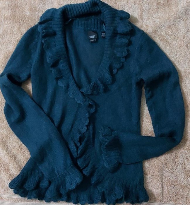 優寶購物《ubao.Tw》特貨品商城,黑貓宅配,取貨付款,(搬家大出清)專櫃品牌 ESPRIT 湖藍綠色針織長袖小外套/外搭,波浪荷葉領及前胸及袖口,無內裡有彈性。美國尺寸 S碼 msgracy clathas 葉珈伶 | Yahoo拍賣