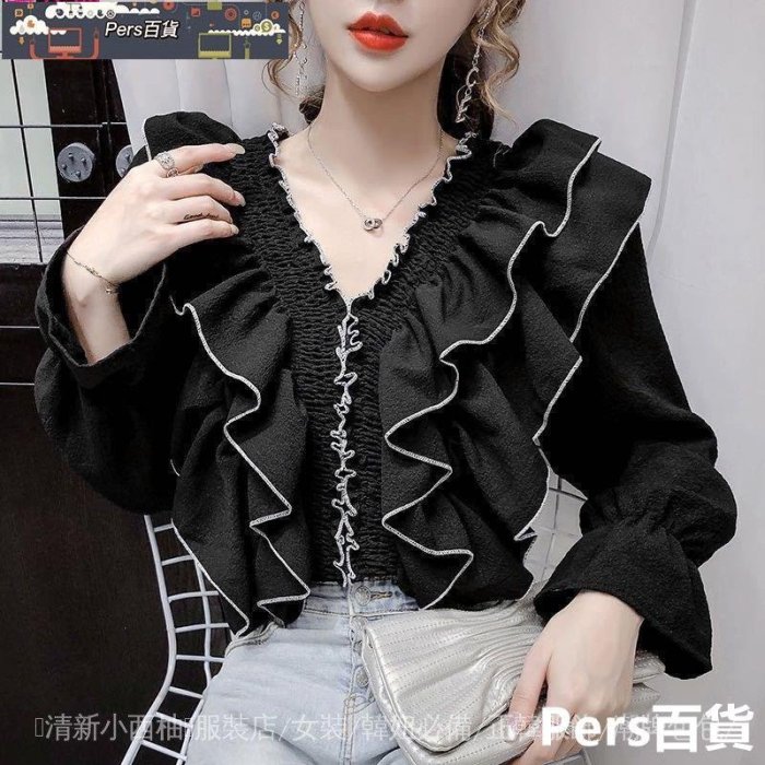 優寶購物《ubao.Tw》特貨品商城,黑貓宅配,取貨付款,【熱賣精選】【快速出貨】韓版新款荷葉邊V領長袖雪紡衫上衣 洋氣喇叭袖襯衫 雪紡襯衫 顯瘦上衣女 壓褶長袖襯衣 打底上衣N | Yahoo拍賣