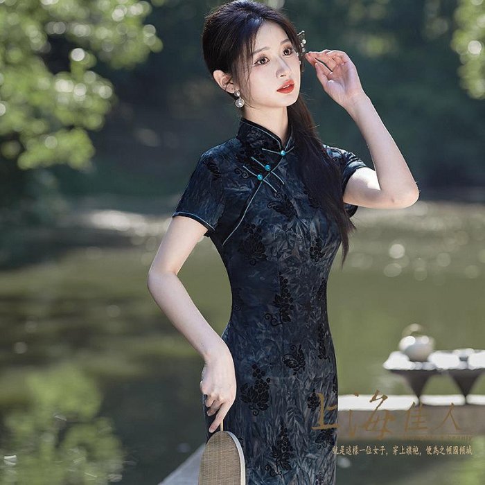 優寶購物《ubao.Tw》特貨品商城,黑貓宅配,取貨付款,夏秋新款國風改良植絨旗袍新中式大碼長款婚宴禮服媽媽演出漢服/CQ19-2/深藍/上海佳人平價旗袍唐裝店 | Yahoo拍賣