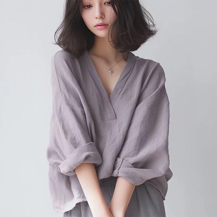 優寶購物《ubao.Tw》特貨品商城,黑貓宅配,取貨付款,法式紫🥂 V領棉麻 無色差長袖襯衫 👚現貨L | Yahoo拍賣