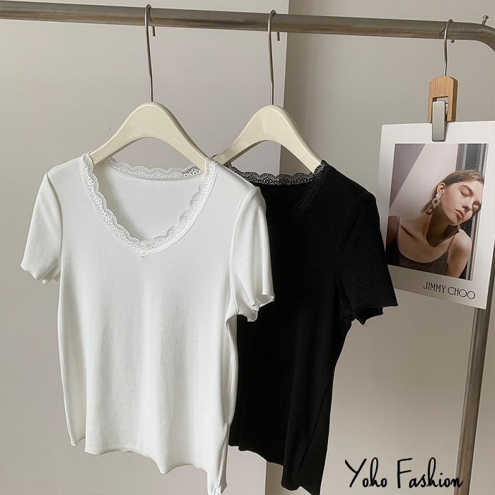 優寶購物《ubao.Tw》特貨品商城,黑貓宅配,取貨付款,特價出清$199 YOHO 短袖T恤 實拍春夏時尚蕾絲邊拼接V領短袖上衣 (DXQ25006) 現貨出清,不退不換 | Yahoo拍賣