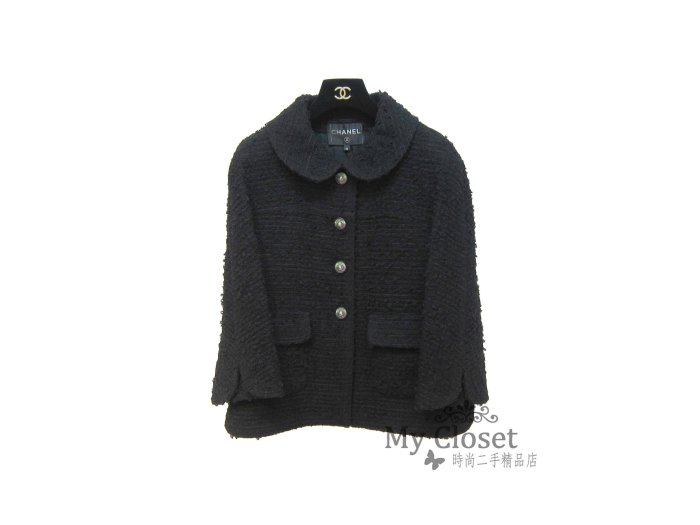 優寶購物《ubao.Tw》特貨品商城,黑貓宅配,取貨付款,My Closet 二手名牌 Chanel 2017 黑色小圓領 A- Line 雙口袋 八分寬袖 軟呢外套 | Yahoo拍賣