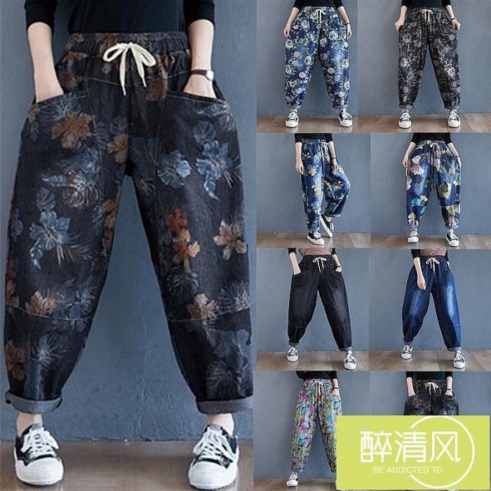 優寶購物《ubao.Tw》特貨品商城,黑貓宅配,取貨付款,大尺碼 牛仔長褲 老爹褲 闊腿褲 寬褲 文藝復古高腰印花牛仔褲 寬鬆大碼哈倫褲 鬆緊腰時尚百搭寬鬆蘿蔔褲 九分褲 女褲【醉清風 | Yahoo拍賣