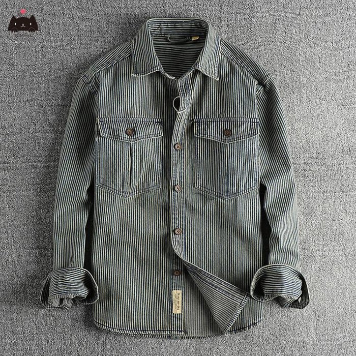 優寶購物《ubao.Tw》特貨品商城,黑貓宅配,取貨付款,色織條紋材質水洗做舊復古工裝牛仔襯衫男士休閒襯衫外套 DV2K | Yahoo拍賣