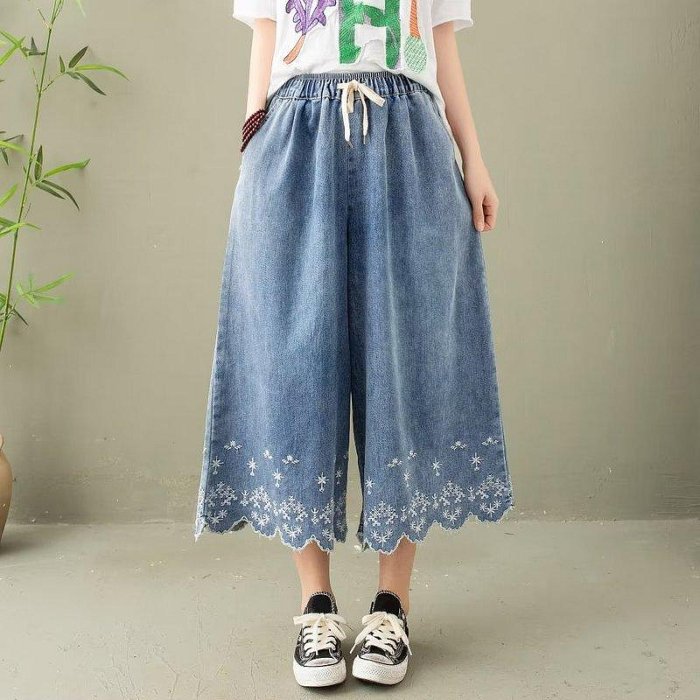 優寶購物《ubao.Tw》特貨品商城,黑貓宅配,取貨付款,夏寬版牛仔褲大碼 牛仔褲裙 牛仔寬褲 寬管褲 春裝 日系波浪花朵刺繡水洗牛仔褲女松緊腰寬松闊腿褲 RX011 | Yahoo拍賣