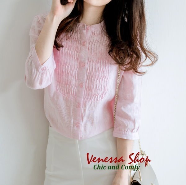 優寶購物《ubao.Tw》特貨品商城,黑貓宅配,取貨付款,歐單 SL 新款 清爽夏日 淺藍色/淺粉波浪褶皺 圓領七分袖 女の涼爽透氣亞麻娃娃襯衫 兩色 (Y523) | Yahoo拍賣