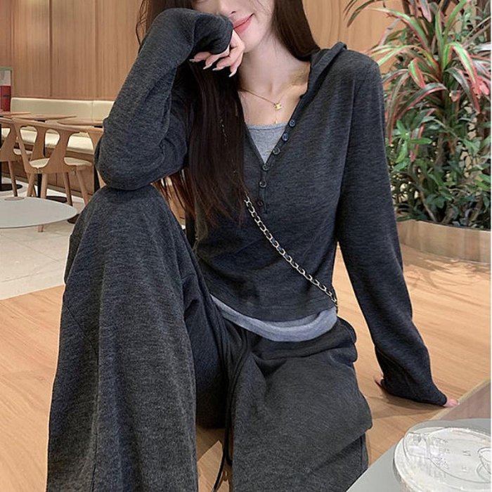 優寶購物《ubao.Tw》特貨品商城,黑貓宅配,取貨付款,假兩件連帽長袖上衣+闊腿寬褲套裝 女生兩件式套裝 秋天運動套裝 顯瘦 連帽T恤 | Yahoo拍賣