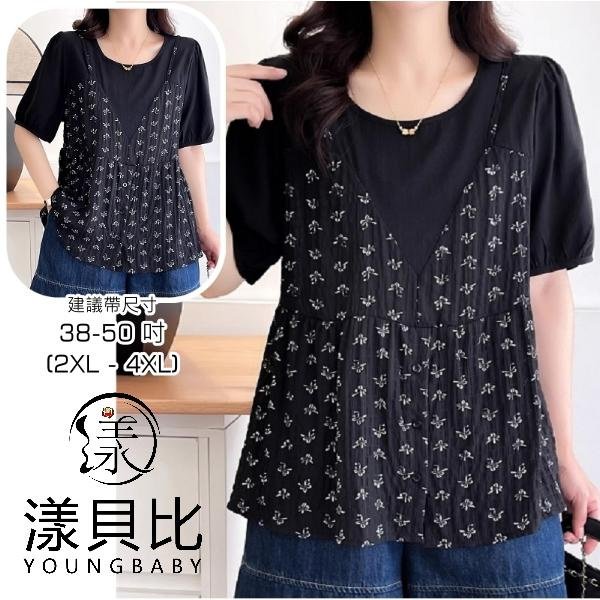 優寶購物《ubao.Tw》特貨品商城,黑貓宅配,取貨付款,漾貝比【9155575】中大尺碼女裝 蝴蝶結印花細肩帶背心泡泡袖假兩件式上衣(38-50) | Yahoo拍賣