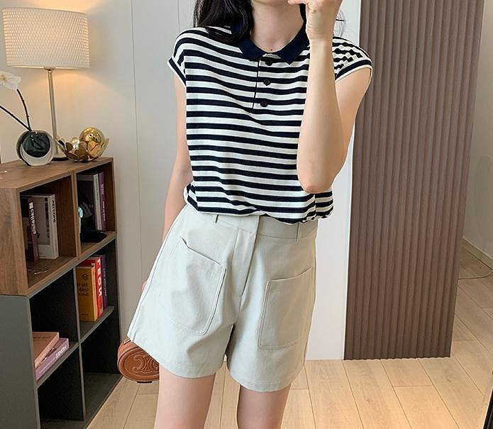優寶購物《ubao.Tw》特貨品商城,黑貓宅配,取貨付款,*有間衣飾*2025夏季新品 小翻領無袖撞色橫紋POLO衫 2色 | Yahoo拍賣