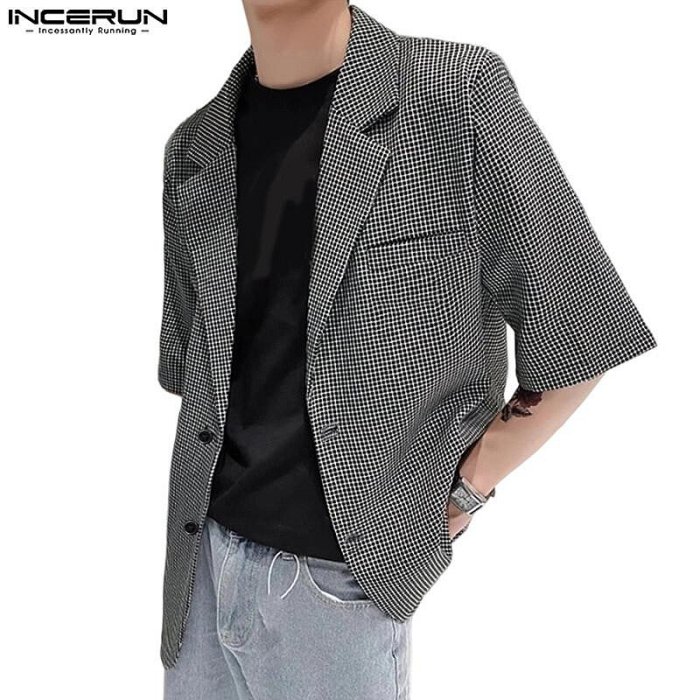 優寶購物《ubao.Tw》特貨品商城,黑貓宅配,取貨付款,INCERUN 男士韓版時尚翻領中袖格紋西裝外套 | Yahoo拍賣