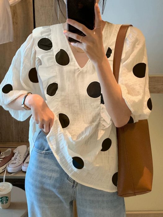 優寶購物《ubao.Tw》特貨品商城,黑貓宅配,取貨付款,優惠 v領寬鬆大黑色圓點荷葉邊寬鬆五分袖上衣 | Yahoo拍賣