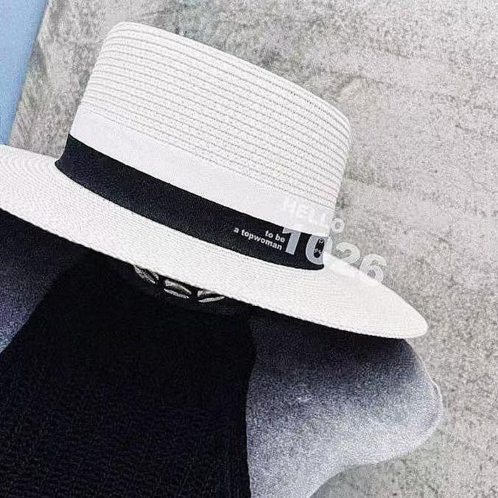 優寶購物《ubao.Tw》特貨品商城,黑貓宅配,取貨付款,+1026+美式 白色寬版緞帶平頂草帽 M字logo 黑白寬帶織帶編織平頂草帽 度假風遮陽防曬紳士草帽 黑色緞帶平頂白色草帽 | Yahoo拍賣