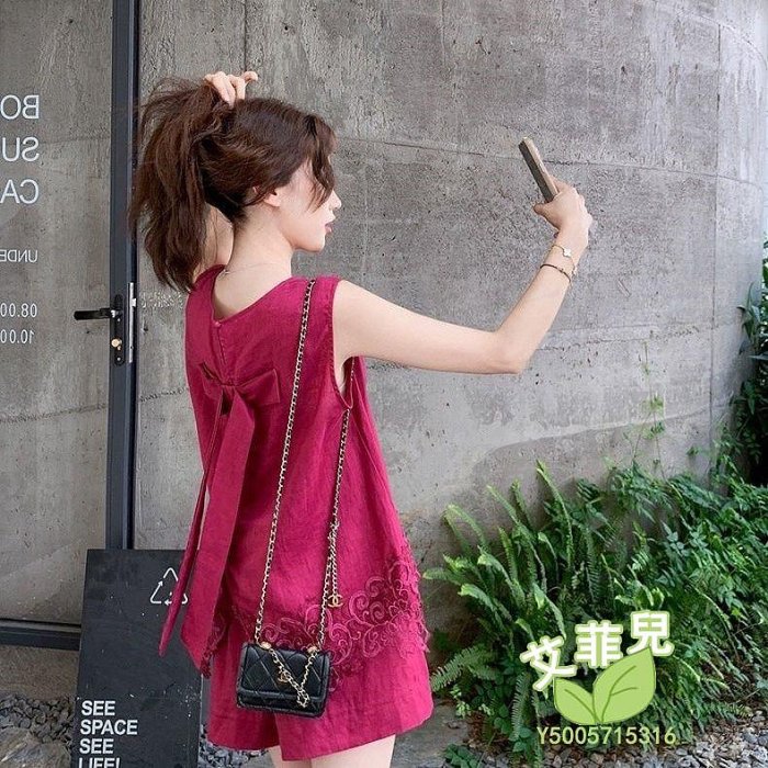 優寶購物《ubao.Tw》特貨品商城,黑貓宅配,取貨付款,艾菲兒=玫紅色蕾絲拼接亞麻無袖背心上衣闊腿褲套裝兩件套女夏元氣少女感 | Yahoo拍賣