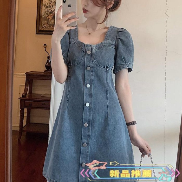優寶購物《ubao.Tw》特貨品商城,黑貓宅配,取貨付款,牛仔連衣裙女夏法式氣質收腰小個子泡泡袖長短款裙子大碼短袖女 | Yahoo拍賣