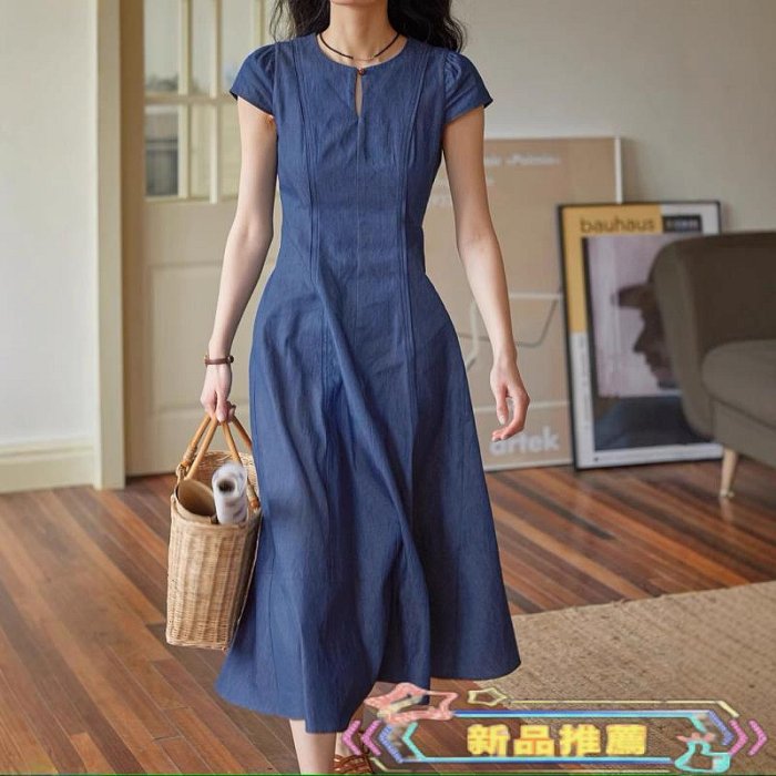 優寶購物《ubao.Tw》特貨品商城,黑貓宅配,取貨付款,solighter 法式一粒扣圓領收腰連衣裙夏季牛仔藍草黃綠休閑風裙子 | Yahoo拍賣
