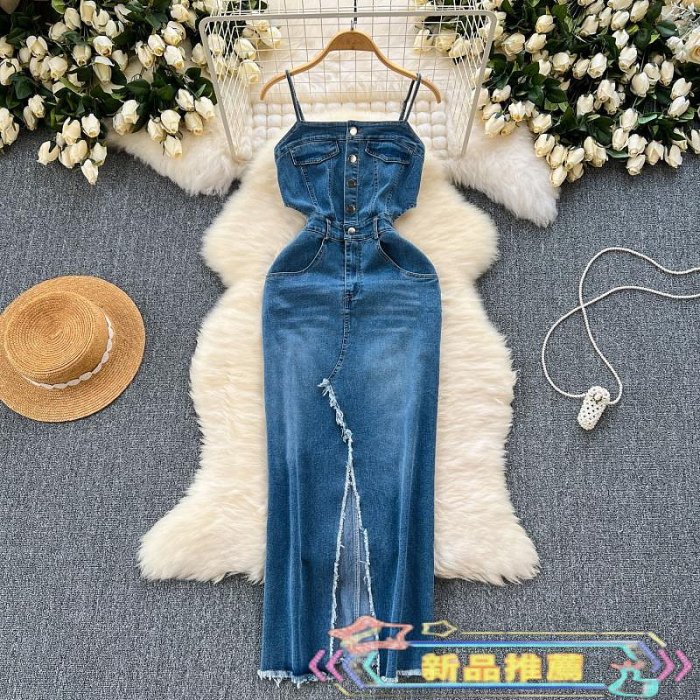 優寶購物《ubao.Tw》特貨品商城,黑貓宅配,取貨付款,chic港風復古牛仔裙子設計感毛邊開叉修身中長款吊帶連衣裙女夏裝 | Yahoo拍賣