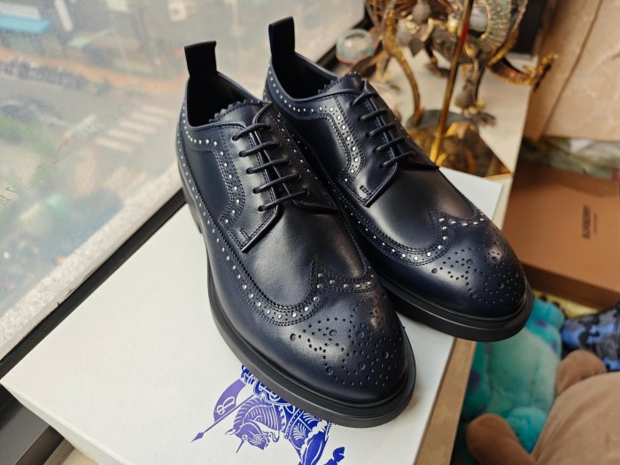 優寶購物《ubao.Tw》特貨品商城,黑貓宅配,取貨付款,BURBERRY全新真品義大利製深藍色鉚釘雕花裝飾小牛皮LOCK布洛克鞋/皮鞋(EU41/42號)--2.2折出清(不議價商品) | Yahoo拍賣