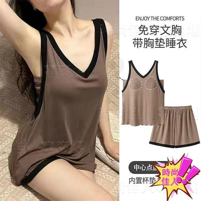 優寶購物《ubao.Tw》特貨品商城,黑貓宅配,取貨付款,时尚佳人=莫代爾無袖背心女夏季自帶固定一體式胸墊家居服睡衣短褲兩件套裝 | Yahoo拍賣