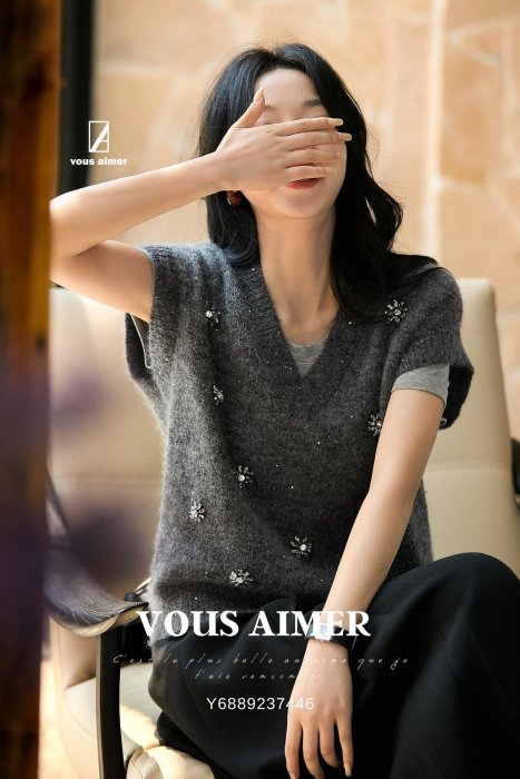 優寶購物《ubao.Tw》特貨品商城,黑貓宅配,取貨付款,XG 50928 輕盈蓬鬆 手工釘珠綿羊毛/馬海毛V領廓形針織馬夾25秋 | Yahoo拍賣