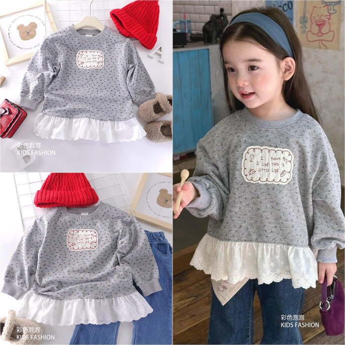優寶購物《ubao.Tw》特貨品商城,黑貓宅配,取貨付款,○。° 彩色泡泡 °。○ 童裝【貨號F31722】秋冬。灰底碎花荷葉蕾絲邊棉T | Yahoo拍賣