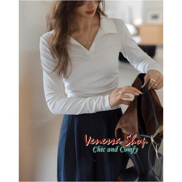 優寶購物《ubao.Tw》特貨品商城,黑貓宅配,取貨付款,小V私家~ 反璞歸真極簡風 INS 新款 彈力修身 女の舒適POLO領短款長袖T恤上衣 打底衫 2色 (P1749) | Yahoo拍賣