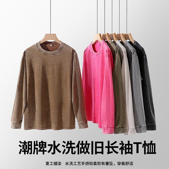 優寶購物《ubao.Tw》特貨品商城,黑貓宅配,取貨付款,240g水洗長袖炒雪花純棉做舊圓領t恤歐美復古男寬松潮體恤衫 | Yahoo拍賣