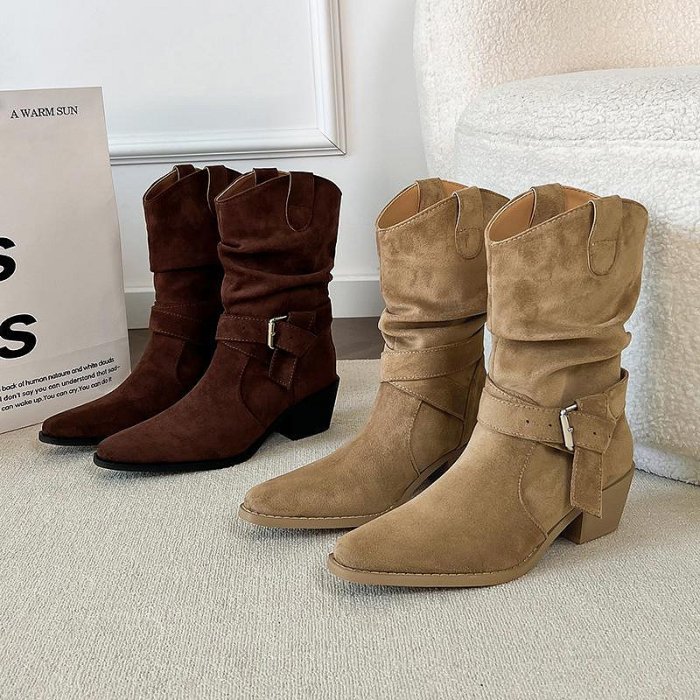 優寶購物《ubao.Tw》特貨品商城,黑貓宅配,取貨付款,木根底~復古風絨面V口西部牛仔靴女高跟尖頭中筒靴皮帶扣堆堆靴 | Yahoo拍賣