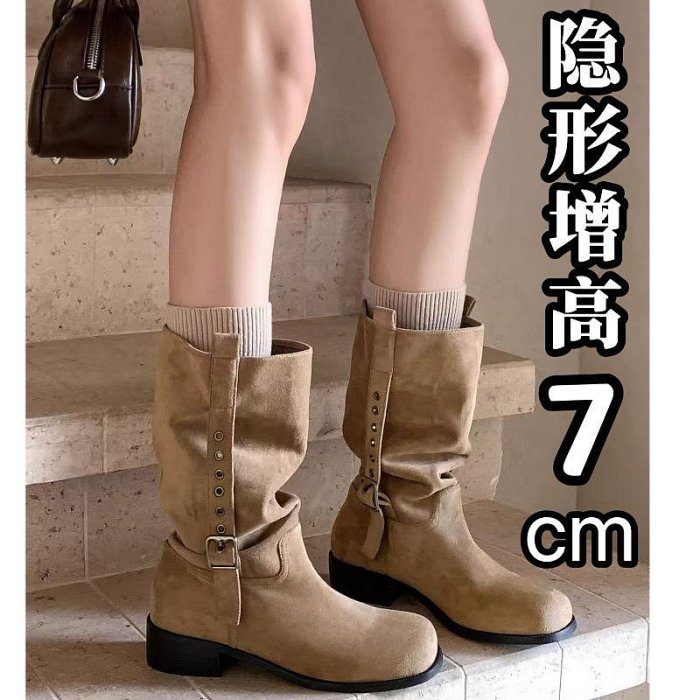 優寶購物《ubao.Tw》特貨品商城,黑貓宅配,取貨付款,內增高褶皺堆堆靴女新款復古顯瘦粗跟絨面西部牛仔靴小個子中筒靴 | Yahoo拍賣