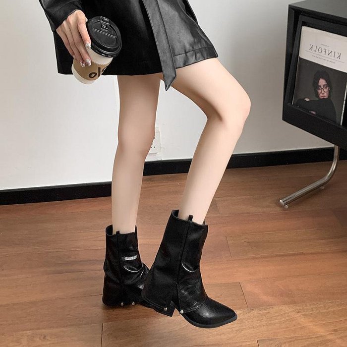優寶購物《ubao.Tw》特貨品商城,黑貓宅配,取貨付款,爆款靴子2025年秋冬季女中筒尖頭粗跟高跟短靴辣妹金屬褲管靴顯瘦 | Yahoo拍賣