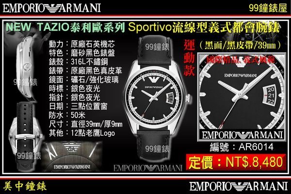 優寶購物《ubao.Tw》特貨品商城,黑貓宅配,取貨付款,【99鐘錶屋】ARMANI :〈NEW TAZIO泰利歐系列〉Sportivo義式都會腕錶-黑面黑帶/39㎜(型號AR6014) | Yahoo拍賣