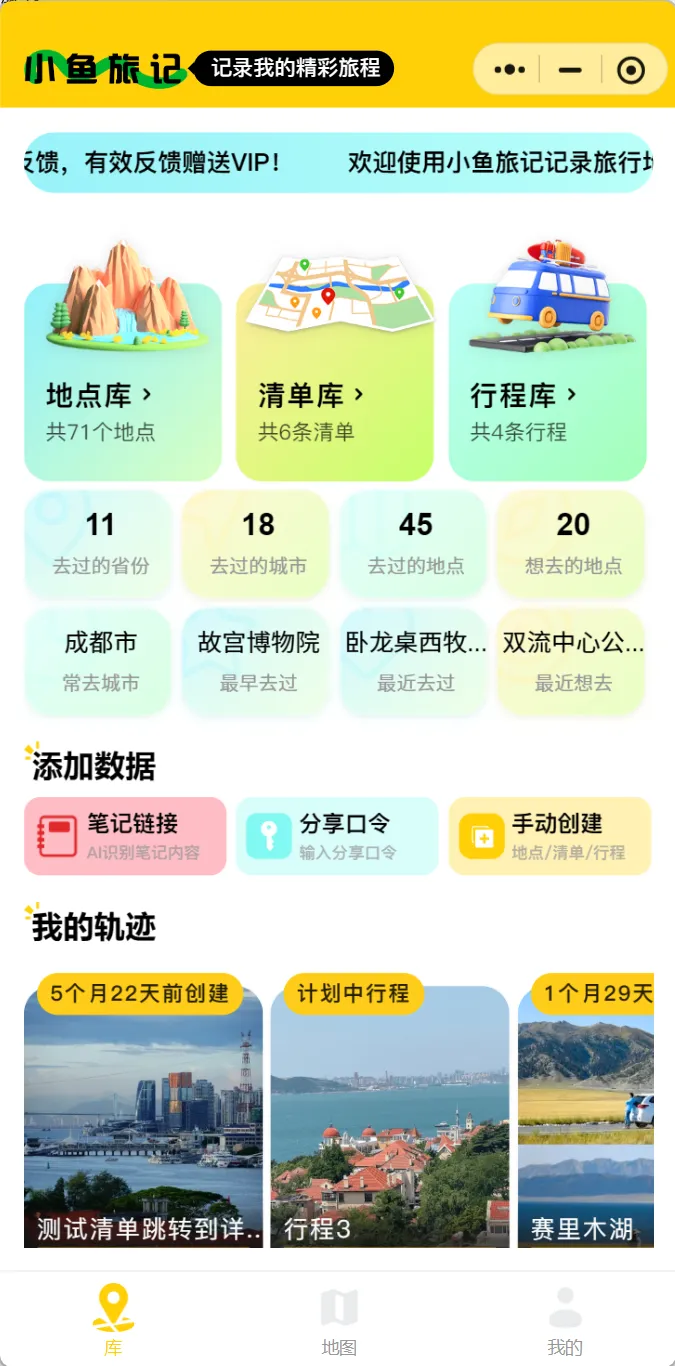 另一方面,就是今天要跟大家分享的第二款产品:小鱼旅记,一款帮助记录自己旅行记录和旅行规划的产品。我知道这方面的产品也有不少,但之所以做这款产品,一是自己有一些专门的需求,比如记录自己曾经去过的好玩的地方,另一方面是练手前端,补完全栈开发前端这一块。希望对有同样需求的 v 友有所帮助,当然也请大家踊跃的提出自己的需求,能做到的,我都会尽快实现。