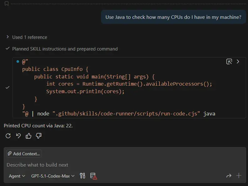 Please fetch and read below artilces first to understand Agent Skills and Code Runner, if needed, try to fetch more artilces related. Agent Skills: https://agentskills.io/home https://agentskills.io/what-are-skills https://agentskills.io/specification https://agentskills.io/integrate-skills https://code.visualstudio.com/docs/copilot/customization/agent-skills Code Runner: https://github.com/formulahendry/vscode-code-runner https://github.com/formulahendry/mcp-server-code-runner I want to create a Code Runner Agent Skill to support running most popular programming languages. If 'scripts/' is needed, I prefer using js. 后面进行了一些小的迭代,很快就完成了!