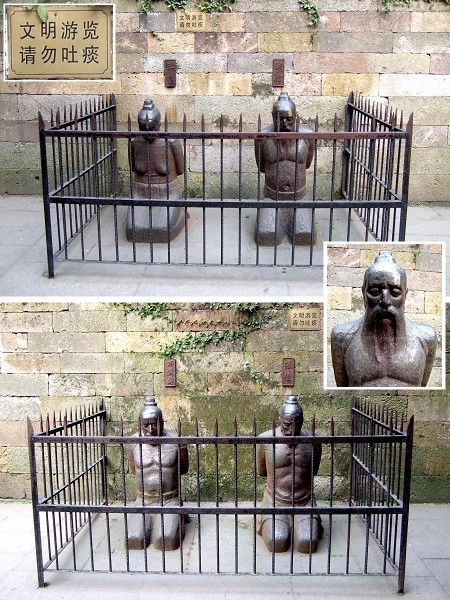墓下立有秦夫(秦、王氏)奸臣(俟、俊)等四人像,他反剪手面墓而跪,在此供人唾,臭年。