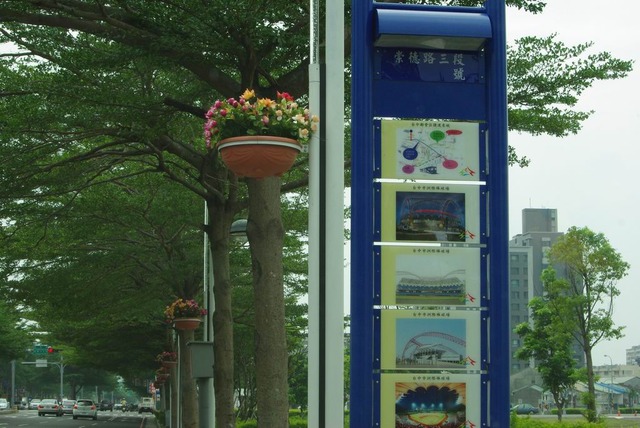台中市地境了,崇德路的路上空架著一排花盆