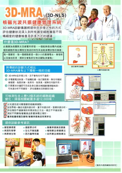 威斯-NLS-MRA(2012版)光波共振描,核磁共振理的原理基所研出的,能以光速完成10器官描只要30分,即可完成全身360 ,3D模描查多108,000,包含人十二大系274的胞化。