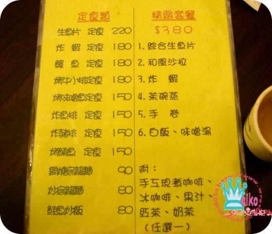 aiko家人,到附近的店家吃定食~就是,和日本料理就是很家庭式,什潢的日本料理店吧台上必的小旗子是店唯一的桌,也是外婆每次都要指定的位置~店的菜,定食都很便宜!背面有一些小菜跟司先一每次必的"中生片",旁附一些的黑豆干唇及海,生片非常新^^每次都要的"炒杏菇",但其一一份定食格一,不算便宜,但嘴就是想吃一下...人多分起也就不算拉~aiko超的"烤牛小排定食",$180元!看看油油亮亮的牛小排,超甜美的照汁,多汁又嫩,最重要的是很多,划算的不得了!旁配上的,相得益彰..."炸定食",$180不要以炸定食只有炸除了炸有茄子,南瓜,青椒等蔬菜,一般天定食,除了比便宜,哈~aiko也好的"烤味增定食",$150淋上檬汁,配上的烤味增.真的是美味,有的一定不要呀^^kj的最,$220~菜有的"烤肚定食"看看有多厚,份量又大,一份220元,你便不便宜?每份定食除了主菜白外,有超棒的和沙拉.汁真的超好吃,很清爽~味增,暖整晚餐的心情,面超多料^^超大碗的茶碗蒸.看看露出一半的蟹肉棒,就知道面很多海料,有,等等,非常美~有每次不同的小菜,次的牛蒡很清脆,的好^^看看多好吃,每都碗底朝天,美味的我把桌面搞的杯狼藉...除了那些定食,很推他的"海苔司",面有小炸,超妙~另外他的子井(打不出ㄉㄨㄥ字),牛井也都超棒的,大家都可以看唷^^不景,越越小,aiko和真是好,吃了那多,平均一人才200出,真的超便宜又划算最重要的是很好吃...的家庭料理店,比市面上便宜的格,有大大的美味喜~台北市街153,想用小吃到的美食?好吃又便宜的和日本料理,用小得大大足的感唷~但有候上菜有慢,耐心等候^^