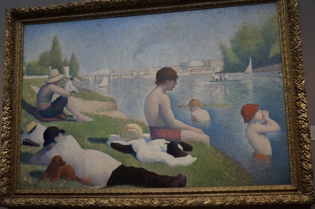 幅巨幅作是 Georges Seurat 秀拉的第一部重要作品,作他未 25 。他本想以此作品在 1884 年春的官方沙展上一人,但最落。作中名男子和男孩在位於巴黎市中心西北部的工郊的塞河畔休憩。中他如同雕塑般一也不,各自沉浸在自己的思中,既不彼此交流,也不互。明亮而朦的光整景,造出一近乎的,彷停,一切都凝固。