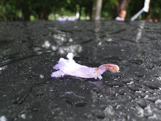 下著雨,站在武德殿的下又看了好一才去。好了,我到下一再次停才,我的「偷」了朵花楹的落花,似仍香行而。