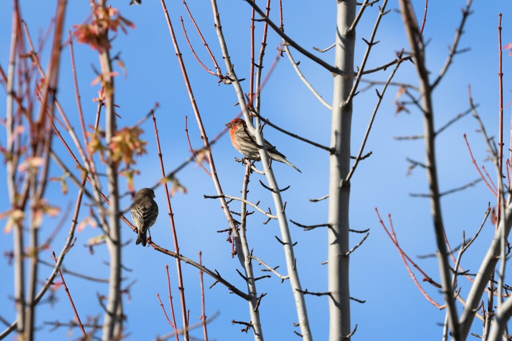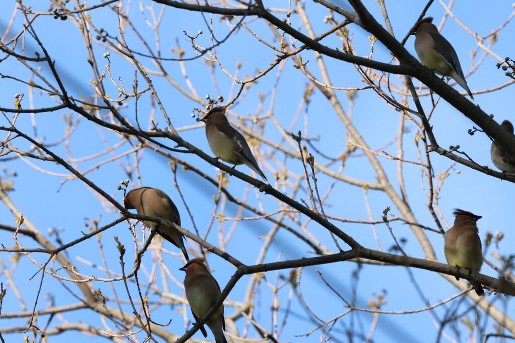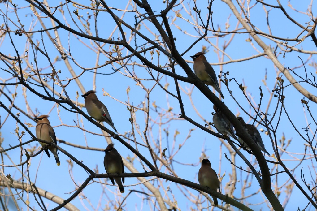 ÏóÎçááÌ죬³ÃÖøÔ糿ÌìÇçÀÊ£¬±³ÖøÏà×ßÍ¥¸÷½ÇÂä¡£¸ôÖø°Ê¿´µ½Ò»´óȺѩËÉ̫ƽ(Ceder Waxwing)ÔÚ¼Ò»¨ÉÏ£¬¿ÐÊ³ÖøÐÂÉúµÄ¹û¡£