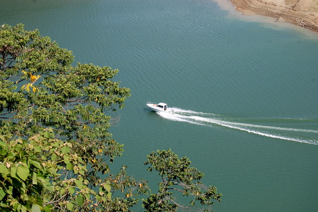 小艇行在水中之波很美~