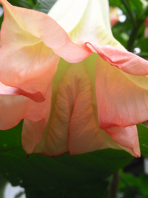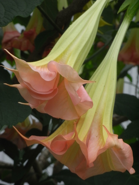 花立,腋出,俯垂,有淡香;花梗 3-5 公分;花萼筒, 8-12 公分,直 2-2.5 公分,中部稍膨,5 裂,裂片三角形, 1.5-2.5 公分,端尖;花冠漏斗, 15-30 公分,粉白至粉色,淡色,筒中部以下而向上大成喇叭,檐部直 8-10 公分,5 裂,裂片有尖,向外、向上反曲;雄蕊 5 枚,不伸出花冠筒,花花冠筒生,下部有毛,花 3 公分;花柱伸出花冠筒,柱稍膨大,2 裂,裂片反曲;子房 2 室,胚珠多。蒴果筒形, 6 公分,表面平滑,熟不裂,但少果。花期春至夏季。