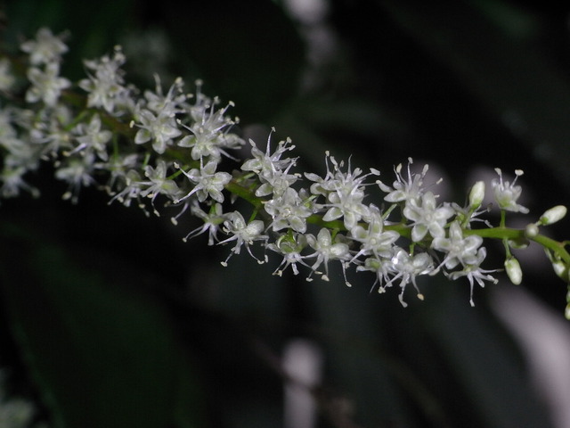 花: 每年 7~8 月是洋落葵的花期,小型白色花是它的代表,每朵花有 5 枚花瓣和 5 枚雄蕊,花序穗花序,花序 10~30 公分;花序上方接花的地方,有一小苞片,呈萼片,薄而透明,色淡粉色。