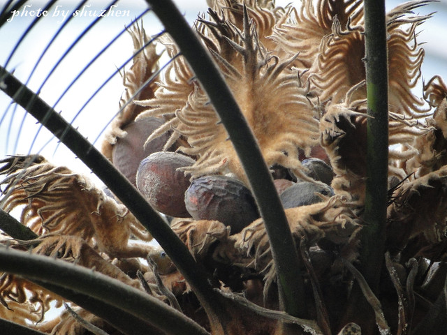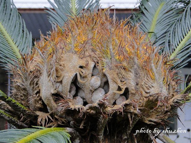 花: 性花,雌雄株,果花生;雄果花 40~60 公分,直 10~15 公分,形,由多片雄蕊螺旋排列而成;片面呈扁形,下面具多花粉囊;囊呈球形,2~3 枚生;雌果花自中心抽出,由多心皮成,似皇冠,球形;心皮羽毛,密被褐色毛,下部各著生胚珠 2~4 枚。花期 4~5 月。