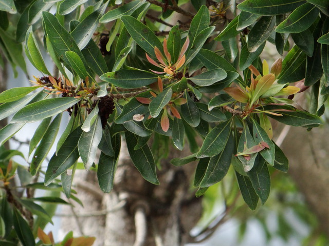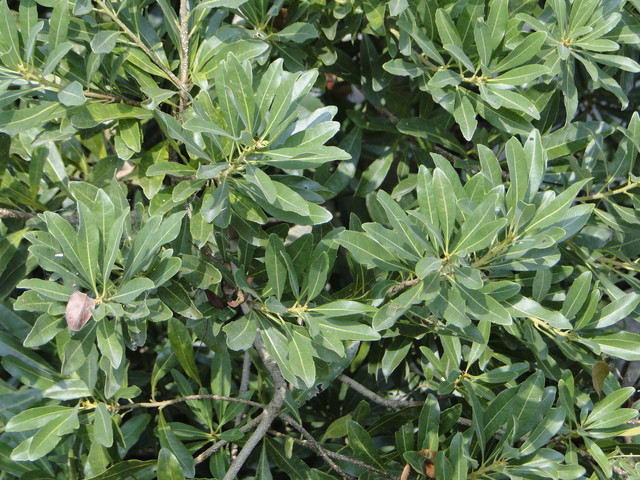 : 互生,多螺旋排列生於枝先端,倒卵形或倒卵披形, 5~9 公分,有亦可 15 公分, 2~2.5 公分,有亦可 3.5 公分,先端或尖,基部或楔形,上半部多散生,半革,表面稍有光的色,背面淡色,中肋、及小於表面皆隆起;柄短, 1~2 公分,光滑毛,有。